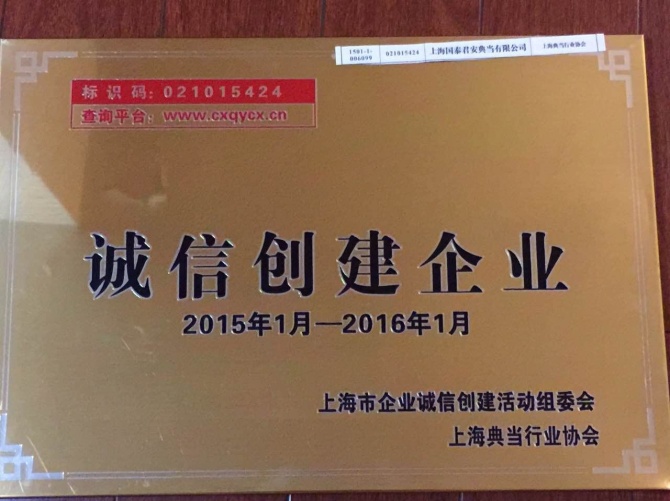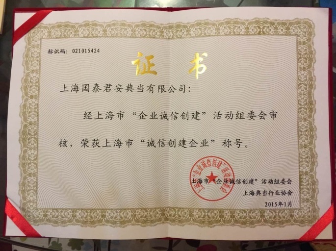 上海国泰君安典当有限公司经过活动前期的自评、审核、申报,通过了上海市“企业诚信创建”活动组委会的最终审核,获上海市“诚信创建企业”殊荣。